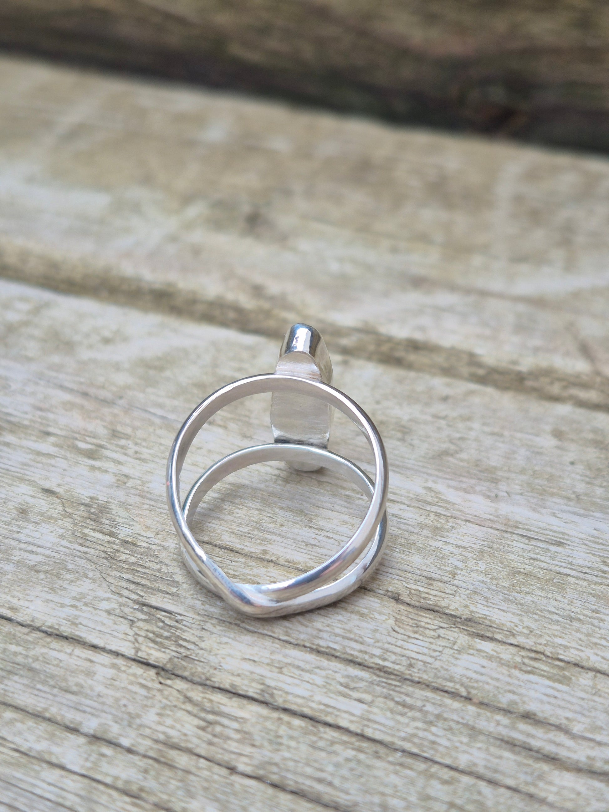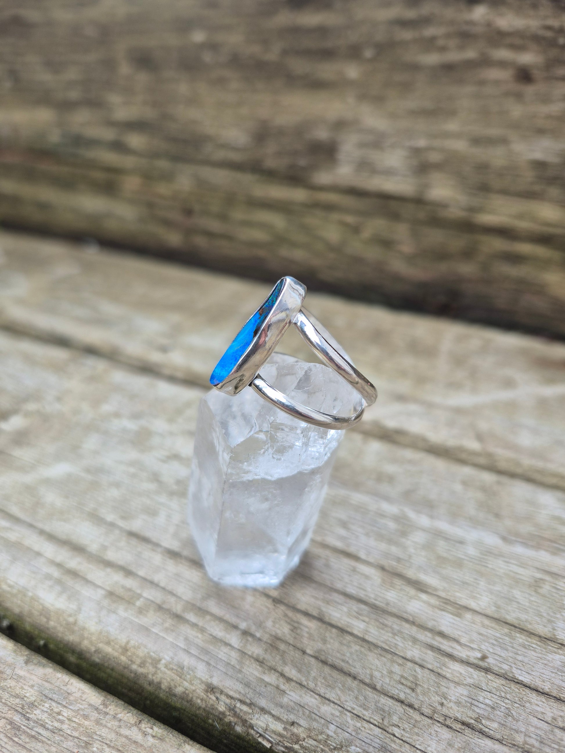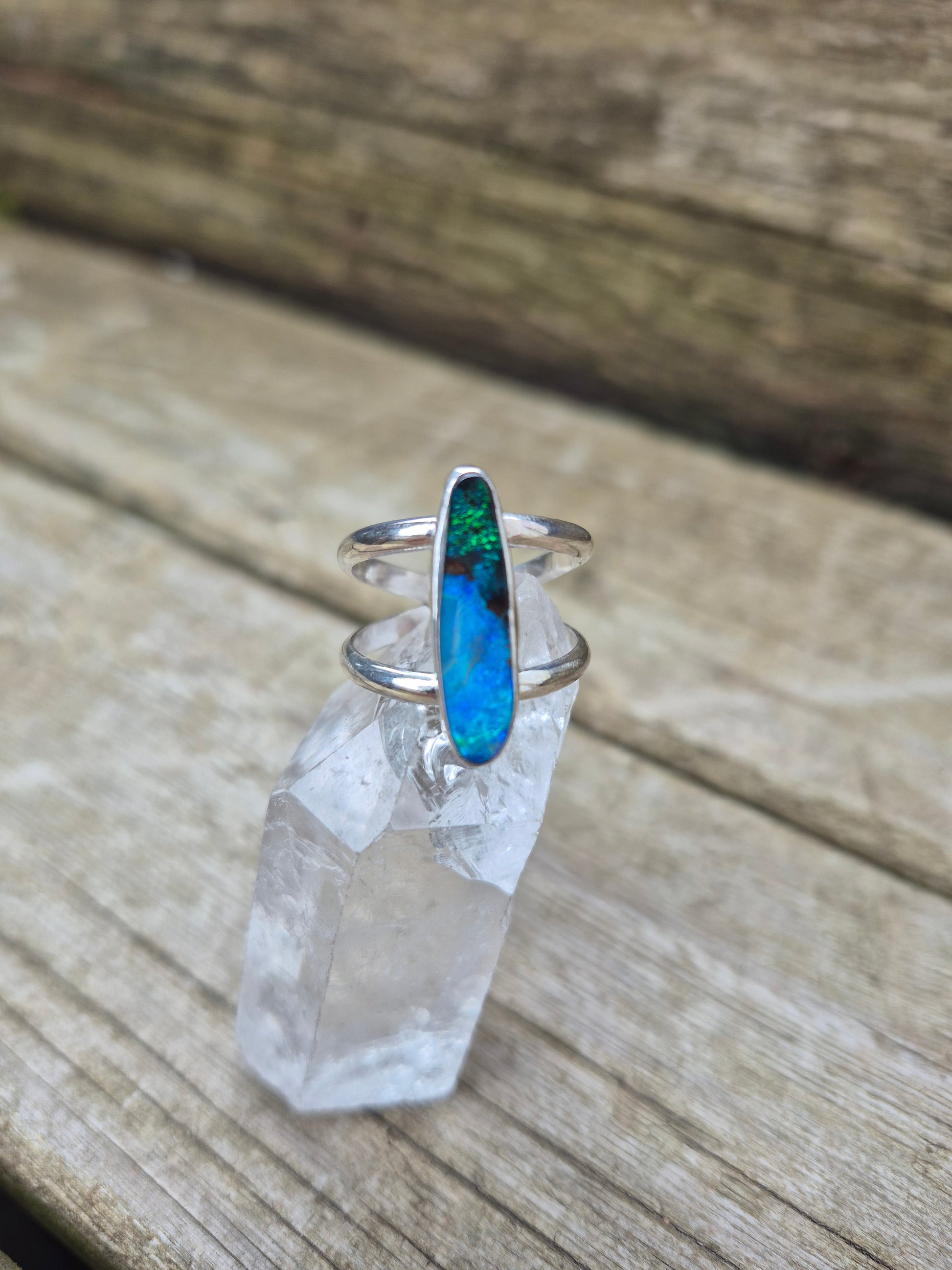 "Accross" - One of a Kind ring featuring a stunning Australian Boulder Opal set in sterling silver. Its minimalist yet bold design ensures comfort and contemporary elegance, making it suitable for various occasions.