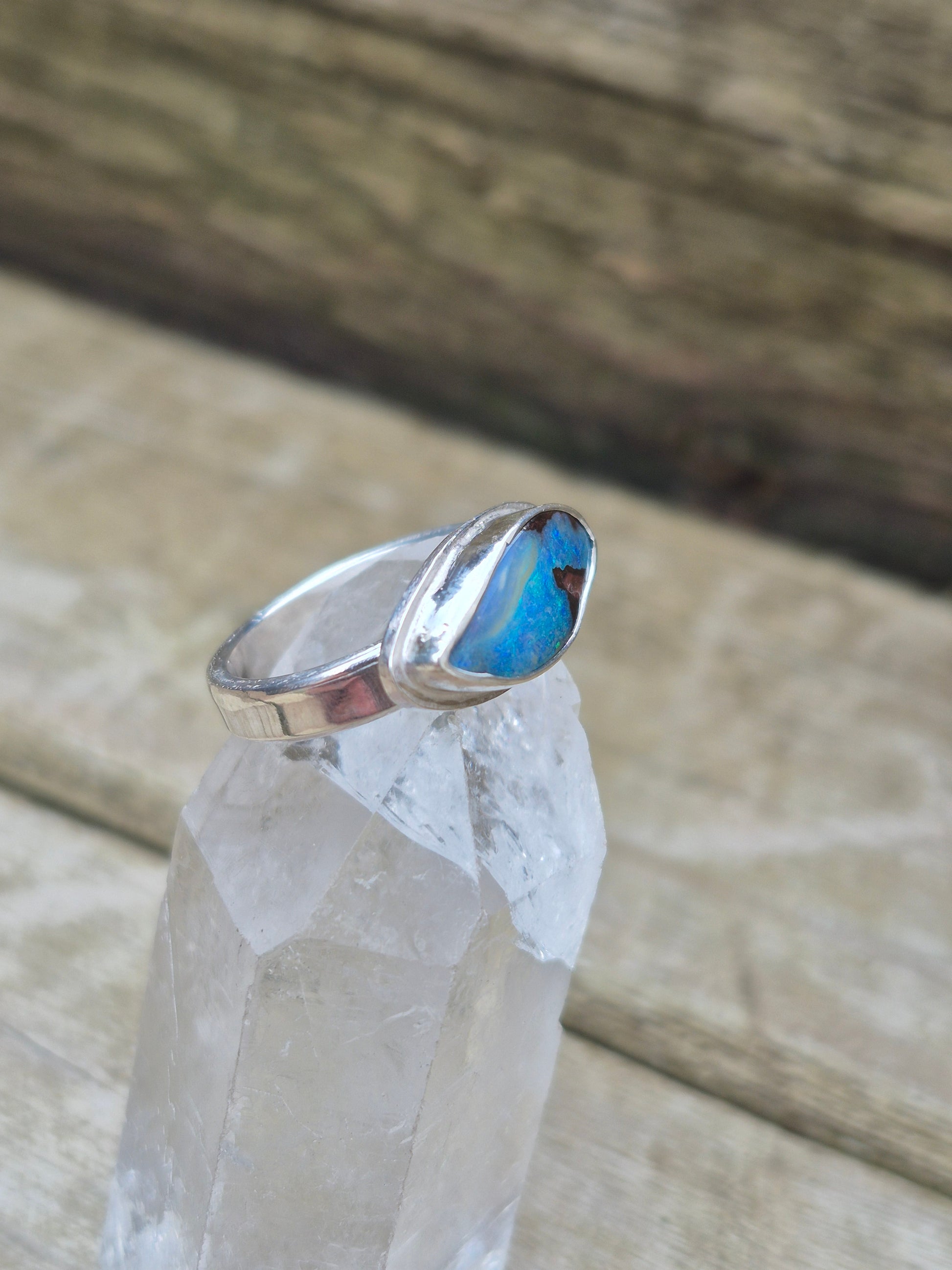 "Wave" - One of a Kind Ring featuring a stunning Australian Boulder Opal set in sterling silver. This simple design highlights the opal's distinctive colors and patterns, making it the star of the show.